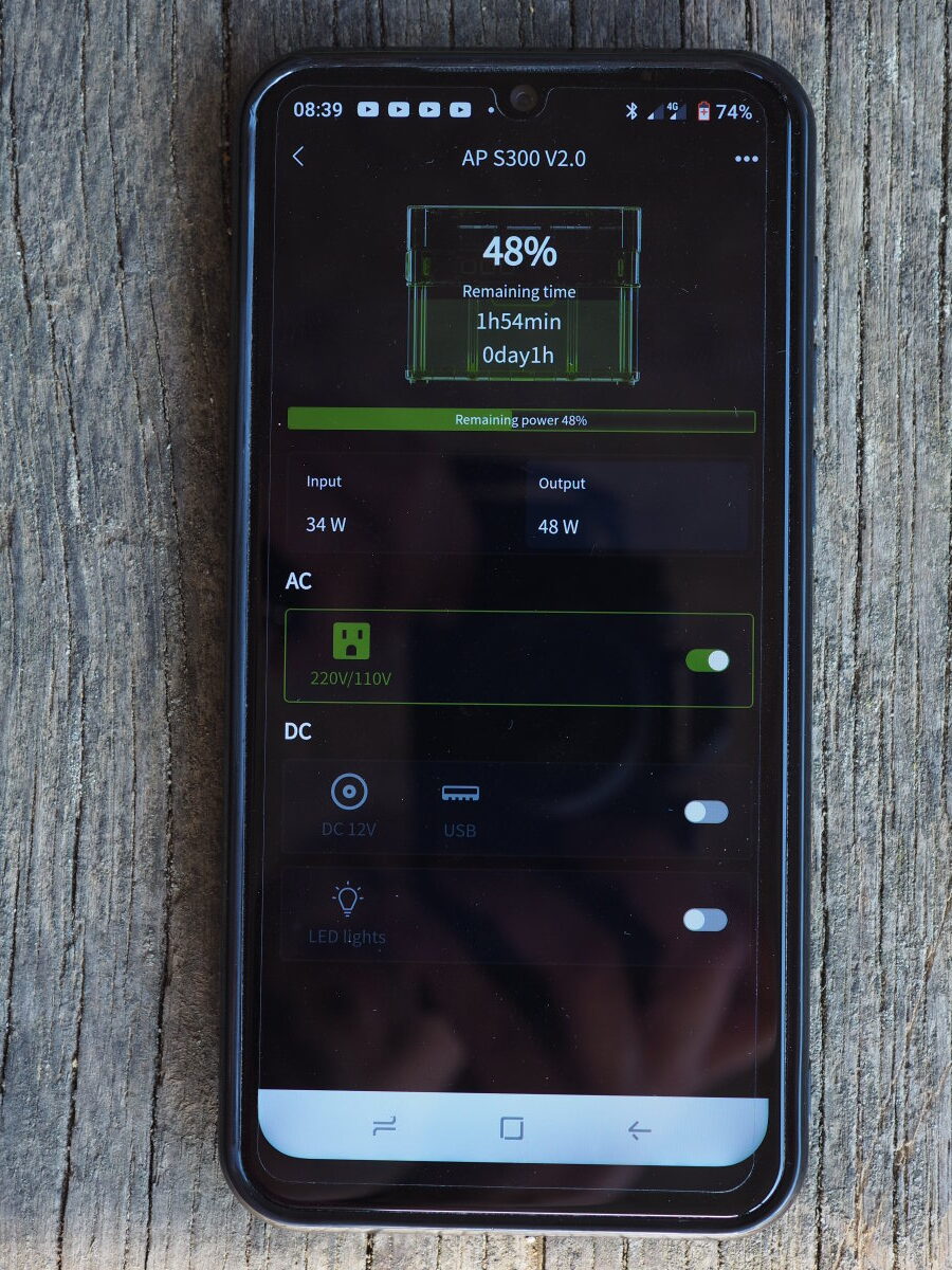 I had the S300 charged at 100% and I started recharging it in the morning at 55%. The recharging process started slow at about 07:30 and even before 08:00, I was getting almost 40% of the panels’ power output already into the S300. Not bad at all! In less than an hour, the SP020 panel was producing 60% of its nominal output. This fact alone got me confident, than for one mans’ needs, this S300 and SP020 combo will be impossible to be dried out of power. Even for larger groups of people, working in the field, its capacity and recharging capabilities would provide sufficient power, without having to worry much. Needless to say that by noon, which was the time I broke up camp, the S300 was full again. The use I made once again laptop and other small devices charging and also playing around with the Allpowers app.